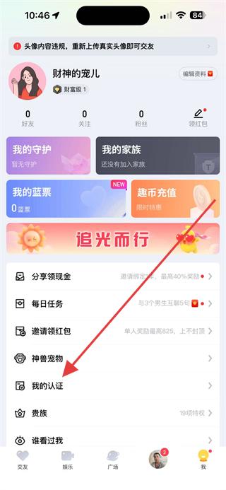 2、在个人页面中找到我的认证选项并点击,进入我的认证页面。
