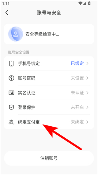 3、在账号与安全页面中找到绑定支付宝选项并点击,进入绑定支付宝页面。