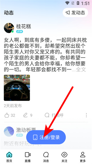 1、在陌陌首页,点击注册/登录按钮,进入登录界面。