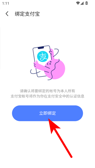 4、在绑定支付宝页面点击立即绑定,按照提示完成支付宝账号的绑定操作。