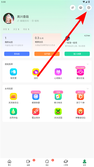 1、打开陌陌APP,点击右下角更多,进入个人功能页面后点击右上角设置图标。